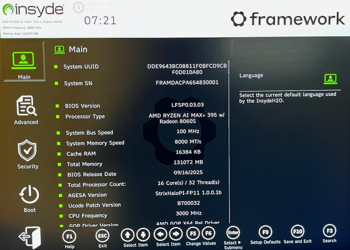 F2 bzw. je nach Tastatur Fn+F2 führt in die BIOS/EFI-Einstellungen. Dort gibt es eine Menge Optionen zur Steuerung des CPU-Lüfters. Der GPU kann ein fixer Speicher (bis zu 96 GiB) zugewiesen werden. Für die meisten Anwendungen ist das aber nicht sinnvoll. Viele Bibliotheken sind in der Lage, den GPU-Speicher dynamisch anzufordern. Insofern ist es zweckmäßig, den fix reservierten GPU-Speicher möglichst klein einzustellen.