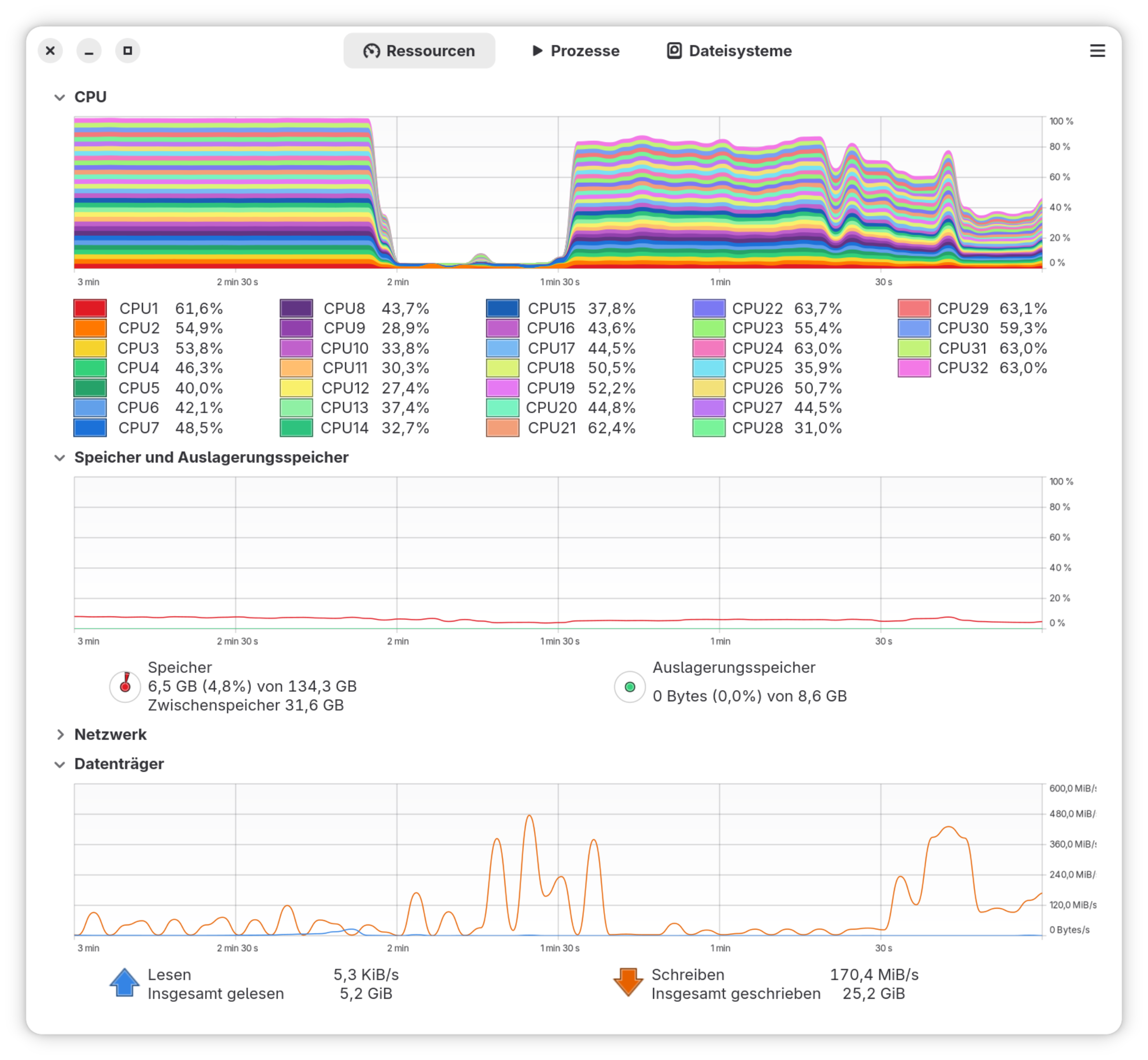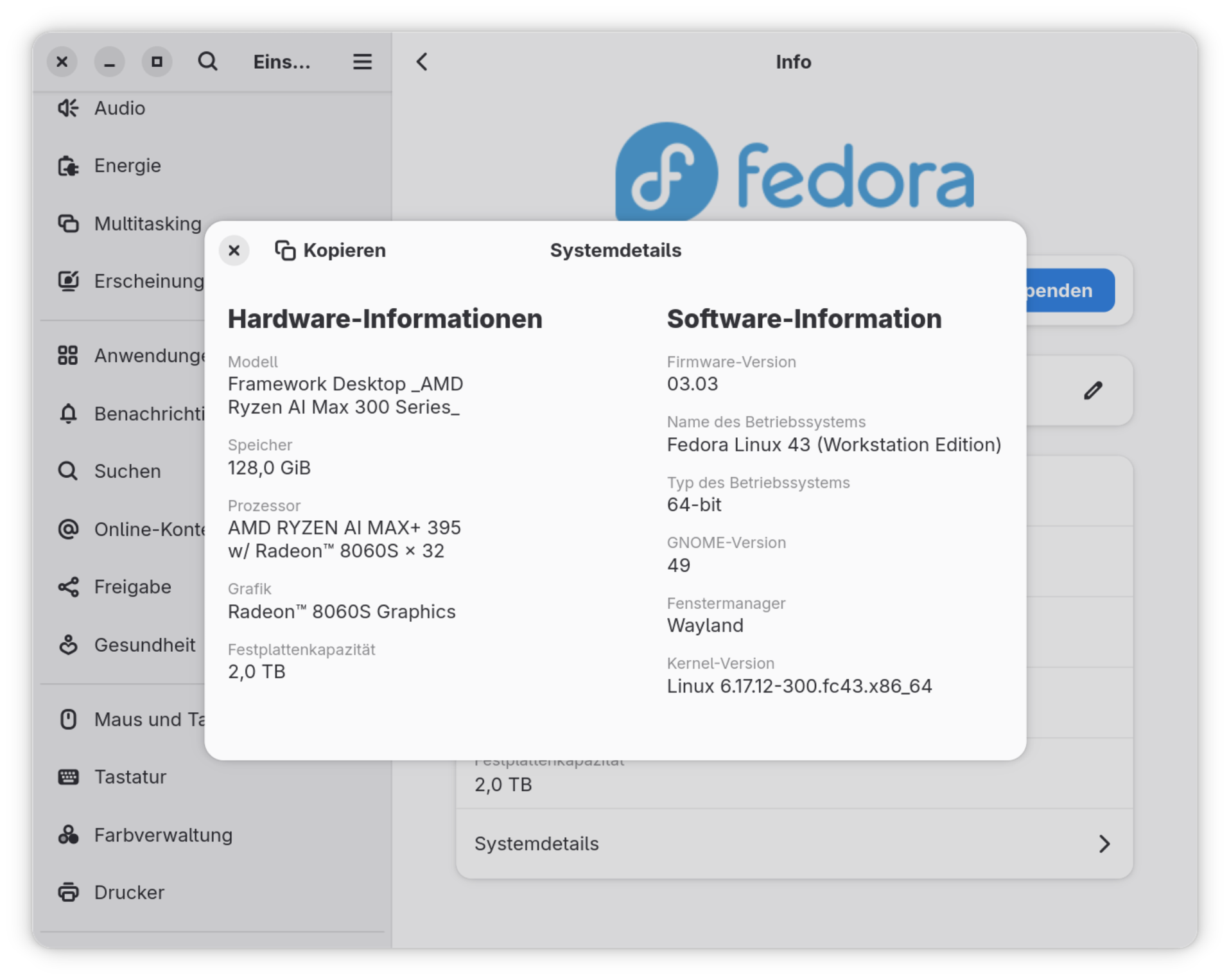 Ich habe mich nicht lange mit Benchmark-Tests aufgehalten. BIOS in Grundzustand, Fedora 43 mit Gnome im Energiemodus Ausgeglichen.