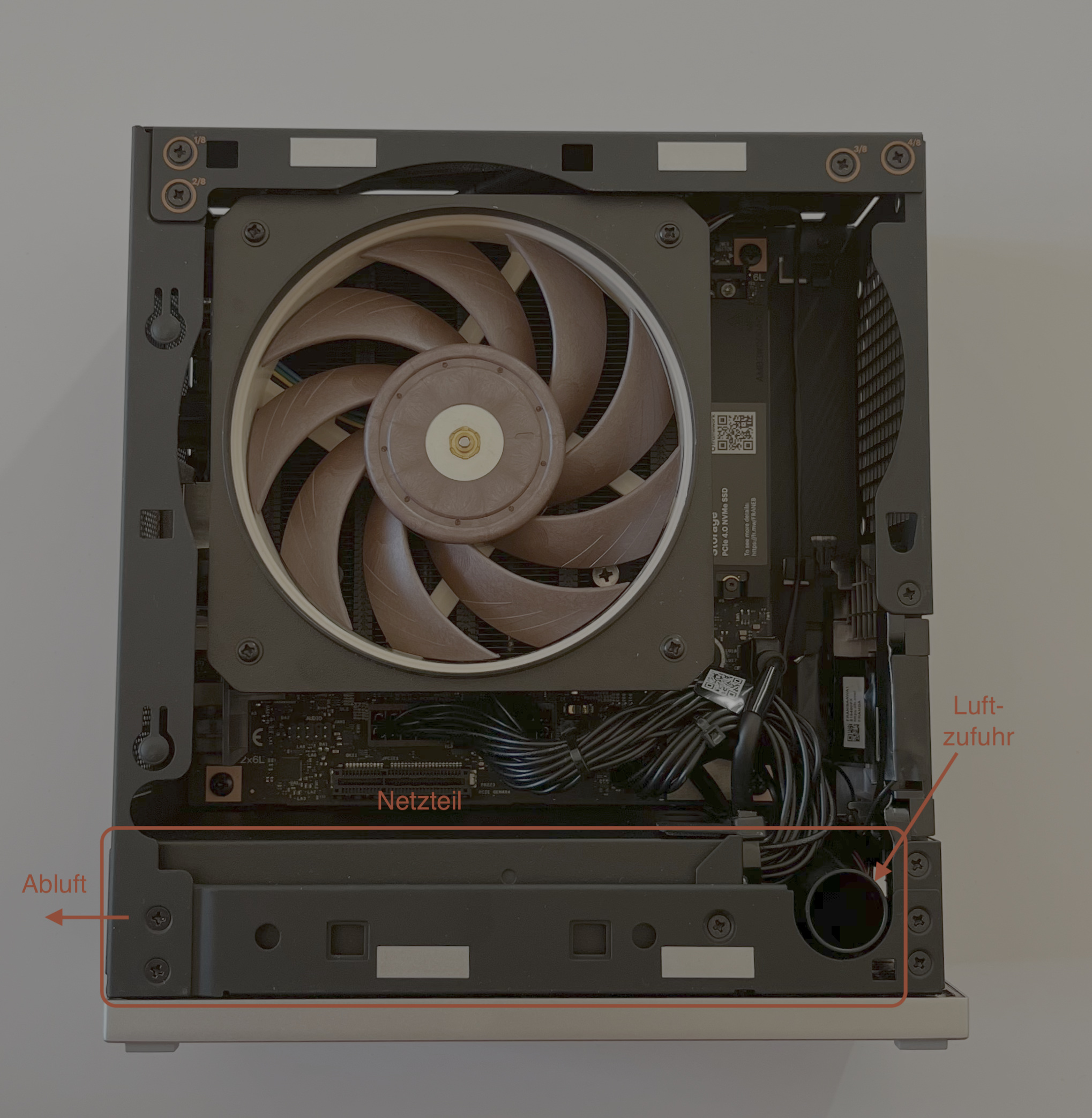 Der Rechner hat zwei Lüfter: einen großen für die CPU (kann beim Bestellprozess konfiguriert werden, ich habe mich für das etwas teurere Noctua-Modell entschieden) und einen kleinen, der unsichtbar aber unüberhörbar im Netzteil am Boden des Rechners eingebaut ist.