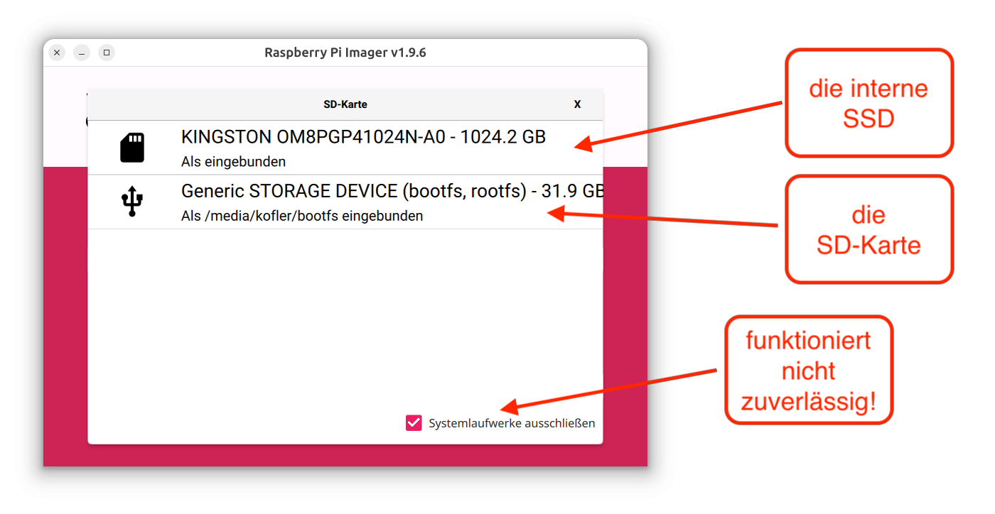 Die »Installation« von Raspberry Pi OS funktioniert wie eh und je: Sie laden die für Ihr Betriebssystem passende Version des Raspberry Pi Imagers herunter und wählen in drei Schritten Ihr Raspberry-Pi-Modell, die gewünschte Distribution und schließlich das Device Ihrer SD-Karte aus. Einfacher kann es nicht sein, würde man denken. Dennoch habe ich es geschafft, auf einem Rechner mit zwei SSDs (einmal Linux, diese SSD war aktiv in Verwendung, einmal Windows) die Installationsdaten auf die Windows-SSD statt auf die SD-Karte zu schreiben. Schuld war ich natürlich selbst, weil ich nur auf das Pictogram gesehen und nicht den nebenstehenden Text gelesen habe. Der Imager hat die SSD mit dem SD-Karten-Icon garniert.